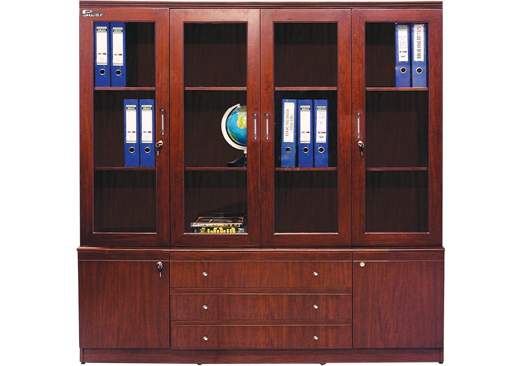 PU Office Cabinet includes 4 compartments with glass doors above. There are 3 drawers and 2 compartments with wooden hinged doors below.