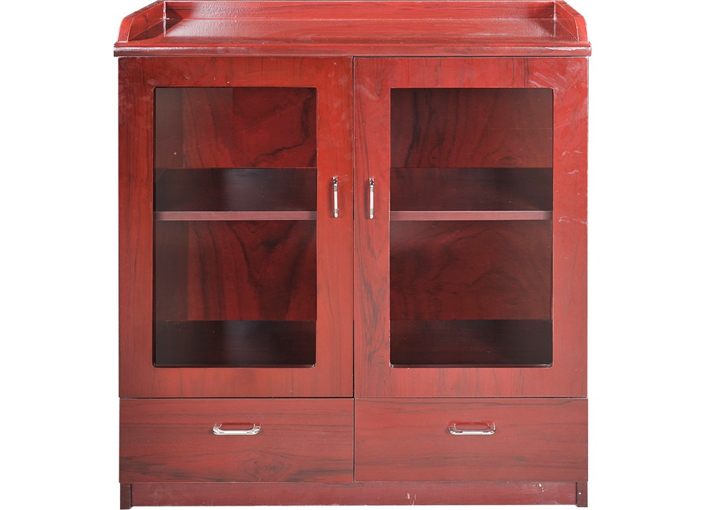 Low PU cabinet with 2 glass doors and shelves. There are 2 drawers in the bottom.