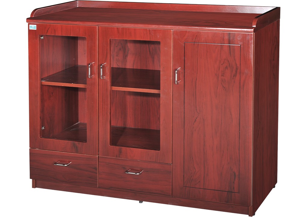 Tủ thấp để tài liệu gỗ sơn Pu có 3 buồng, trong đó hai buồng phía trên là khoang cánh kính. Phía dưới là ngăn kéo, buồng còn lại là cánh gỗ mở.