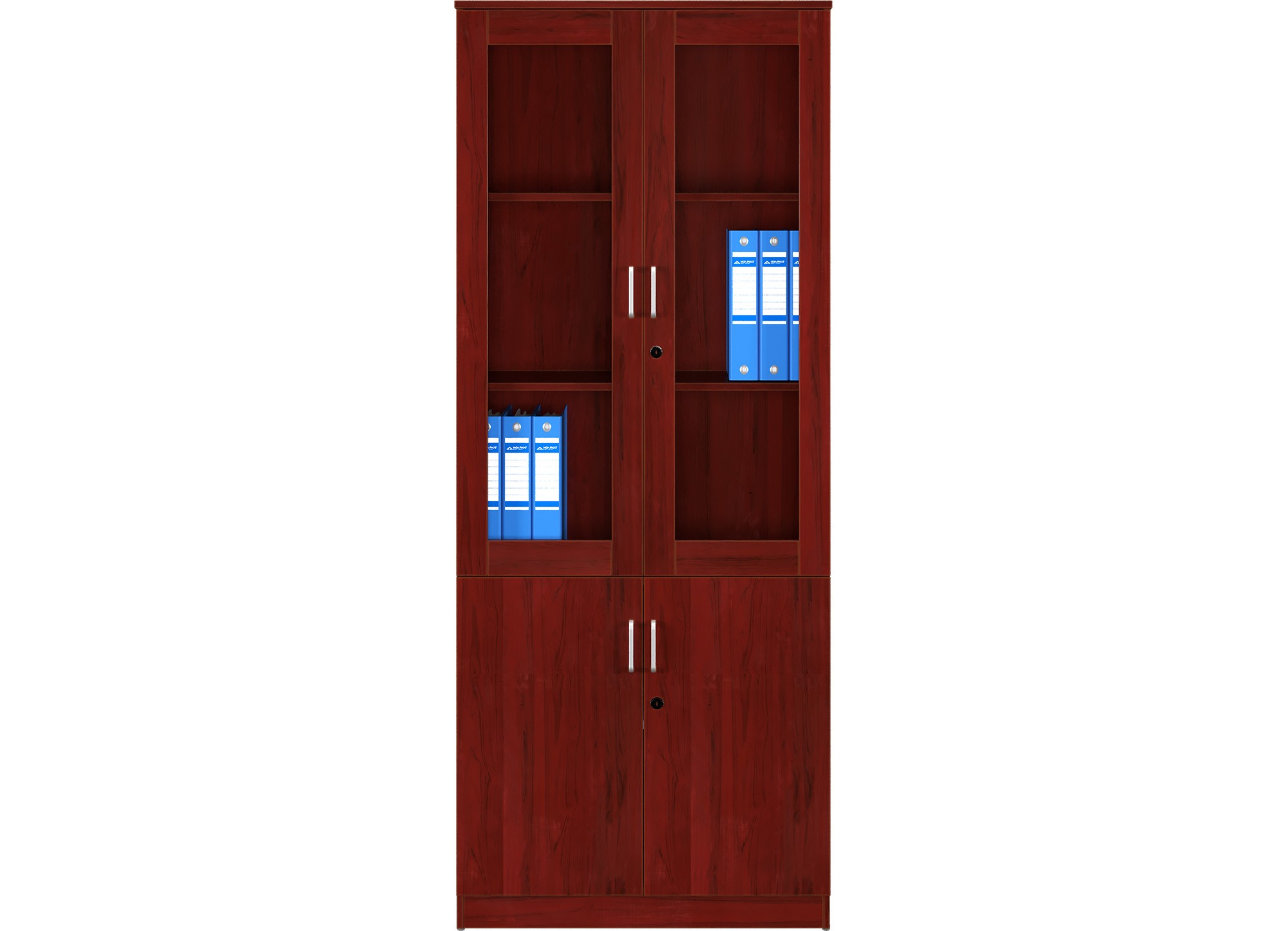 Tủ tài liệu 2 khoang: khoang trên có 2 cánh kính khung gỗ, khoang dưới có 2 cánh mở có khóa. Thành tủ gỗ dày 15mm, tay nắm nhôm, khóa chìa trắng