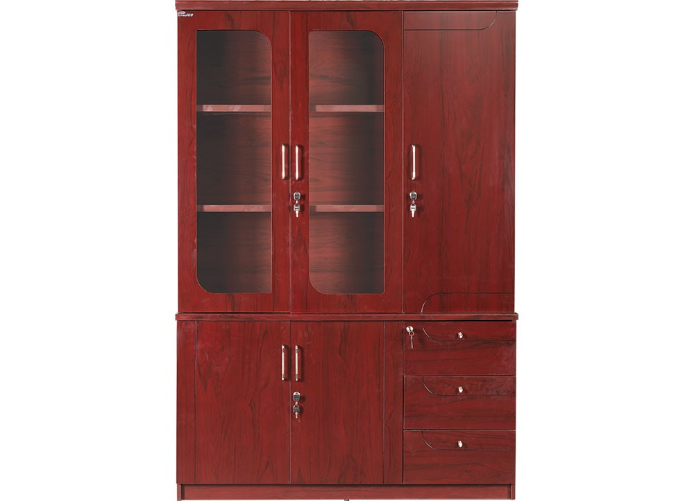 Tủ tài liệu 3 khoang, phía trên gồm 2 cánh kính để tài liệu và 1 khoang treo áo, phía dưới có 3 ngăn kéo và hai cánh mở.