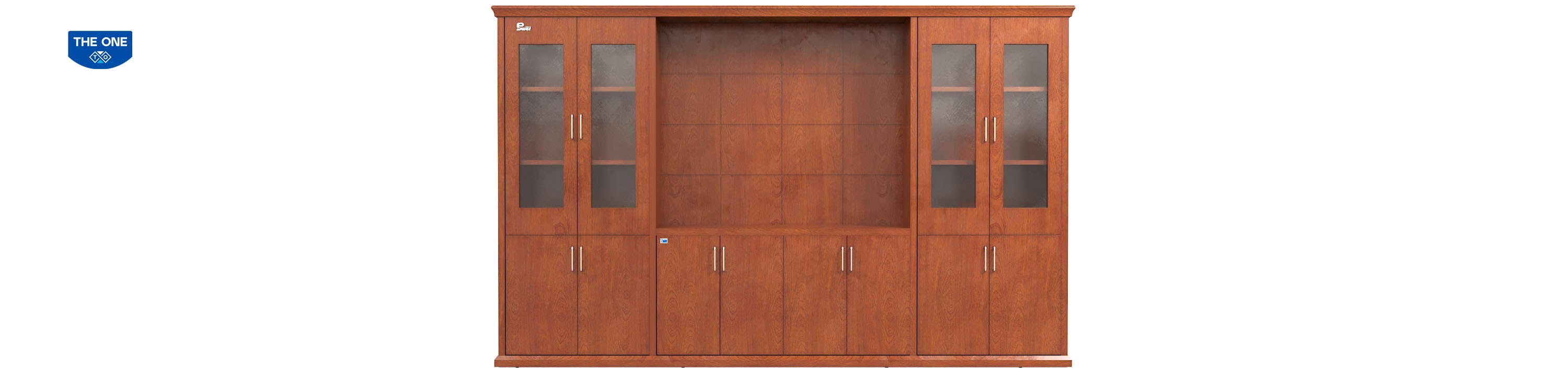 Tủ tài liệu cao cấp gồm 8 khoang, phía dưới là cánh gỗ mở, phía trên là cánh kính, ở giữa là khoang trống.