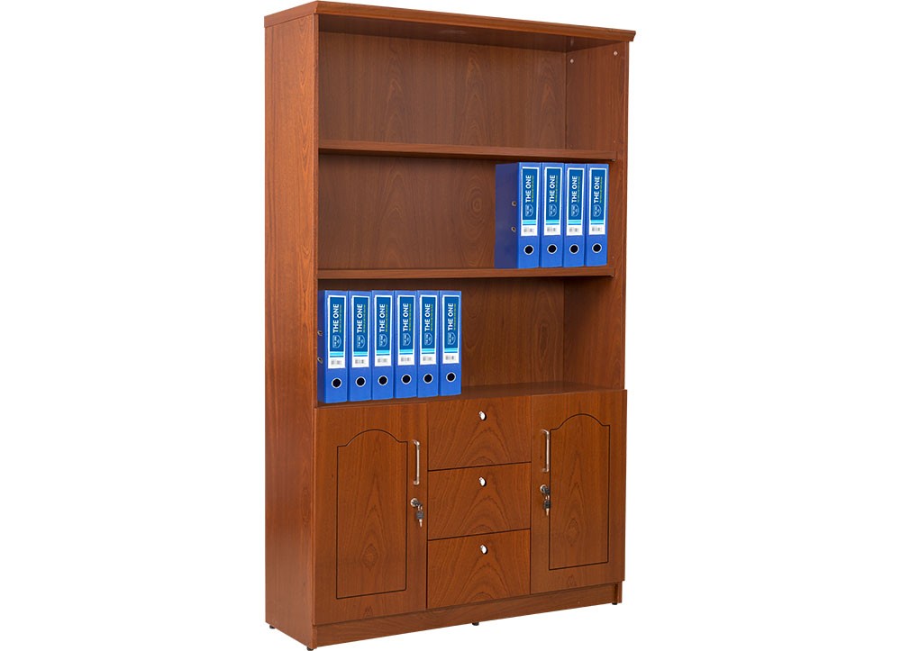 Tủ tài liệu 3 khoang có khoang trên có 2 đợt, khoang dưới có 2 cánh mở và 3 ngăn kéo.