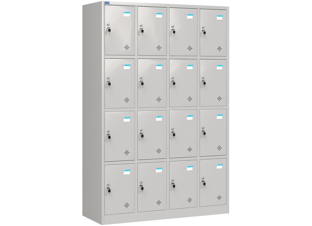 Tủ sắt sơn tĩnh điện 16 khoang cánh mở. Trên mỗi cánh có 1 khóa Locker, núm tay nắm và tai khóa móc.