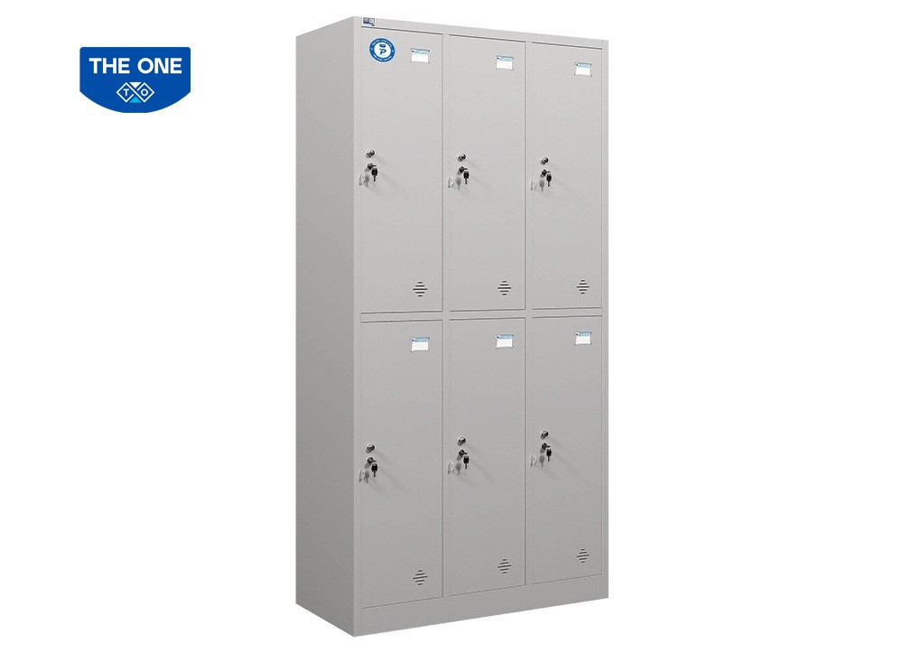 Tủ sắt sơn tĩnh điện 6 khoang cánh mở, bên trong mỗi khoang có 1 đợt cố định và 1 suốt treo quần áo. Trên mỗi cánh có 1 khóa Locker, núm tay nắm và tai khóa móc.