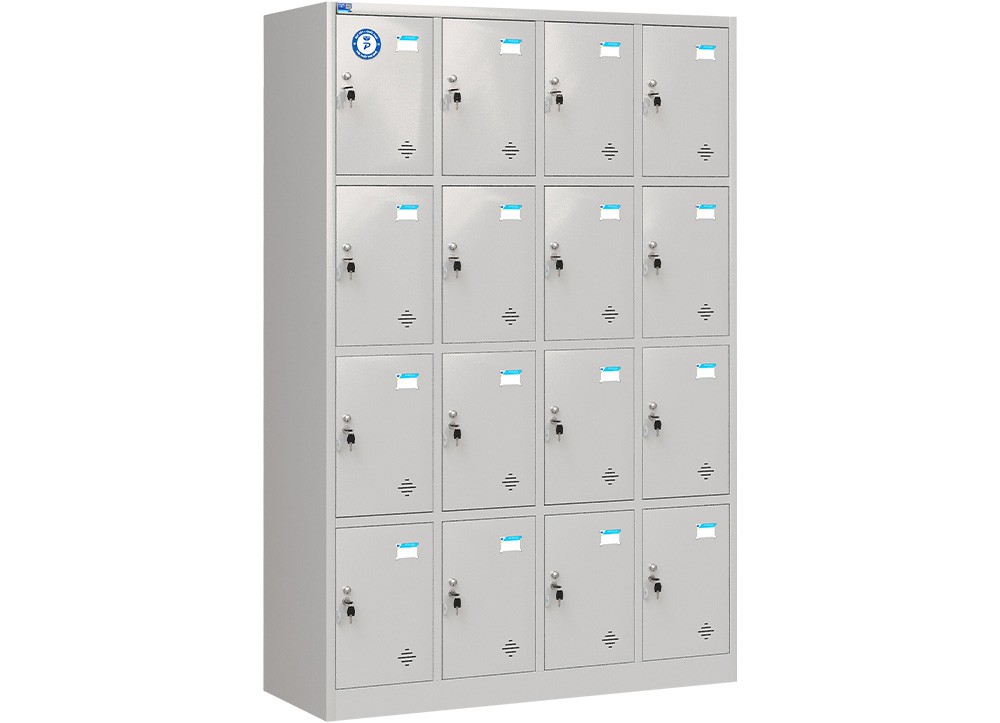 Tủ sắt sơn tĩnh điện 16 khoang cánh mở. Trên mỗi cánh có 1 khóa Locker, núm tay nắm và tai khóa móc