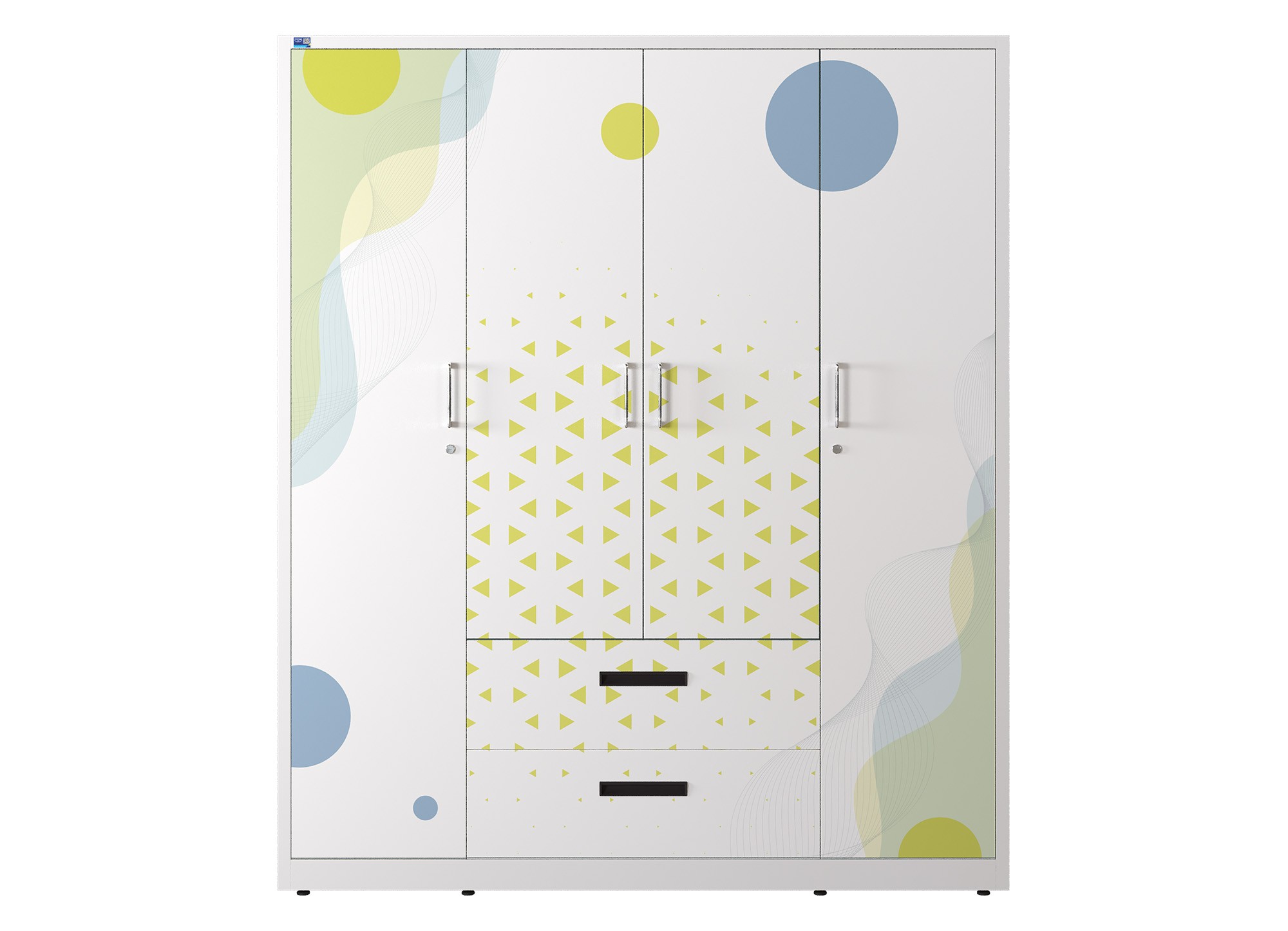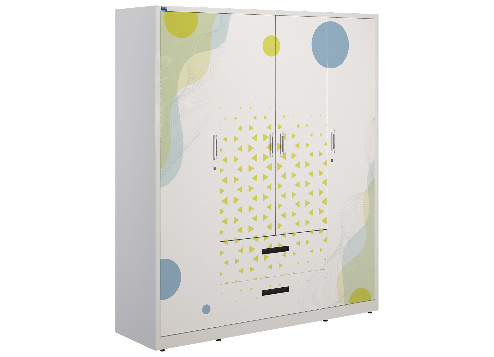 Tủ quần áo 4 cánh mở với 2 ngăn kéo tiện lợi để đồ. Khoang bên trái được trang bị 1 suốt treo áo và 2 đợt di động. Khoang giữa có 1 suốt treo áo cùng 1 đợt di động, trong khi khoang bên phải có 2 đợt di động và 1 ngăn phụ có khóa, đảm bảo an toàn cho các vật dụng quan trọng.